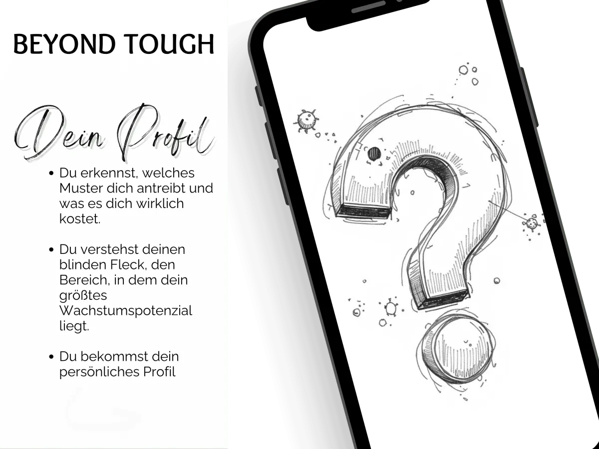 Dein kostenloses Beyond Tough Profil – in 5 Minuten zu deinem persönlichen Muster. Inklusive exklusivem Minikurs zur inneren Erlaubnis (4 Videos) und dem PDF-Guide zu deinen inneren Antreibern. Im Gesamtwert von 124€ kostenlos für dich.